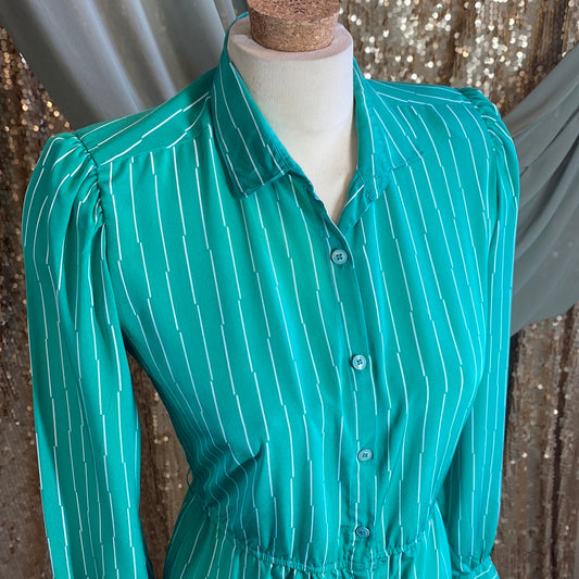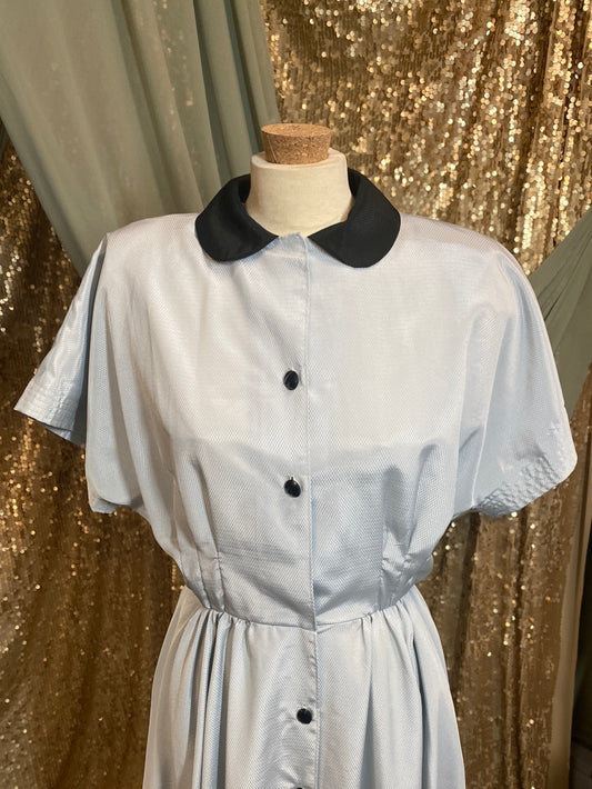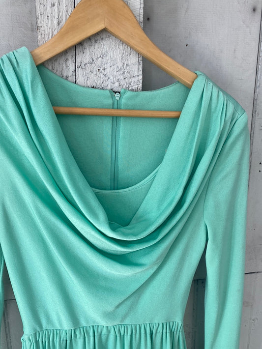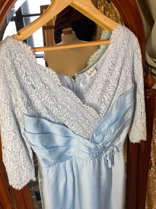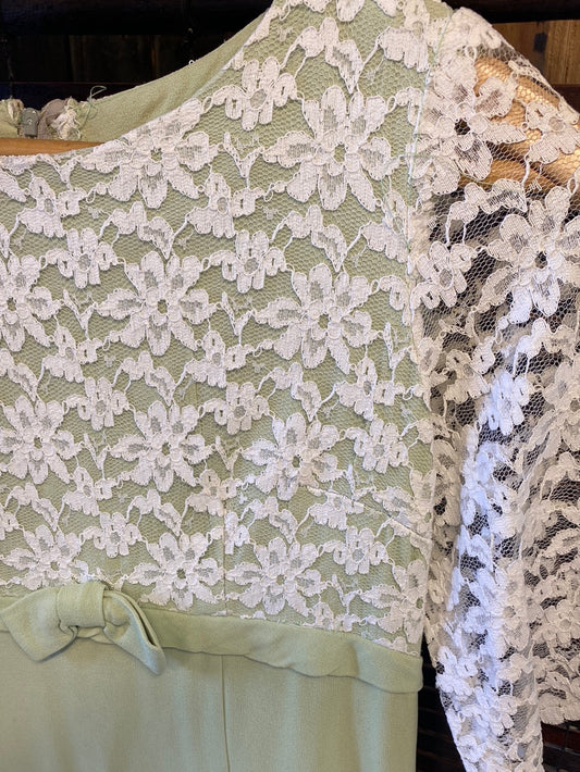 Robe de couturière 1960 vert pastel en crêpe et en dentelle
